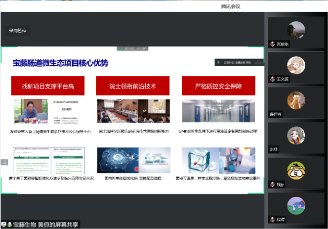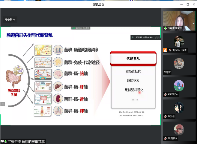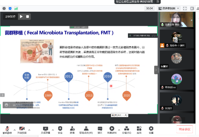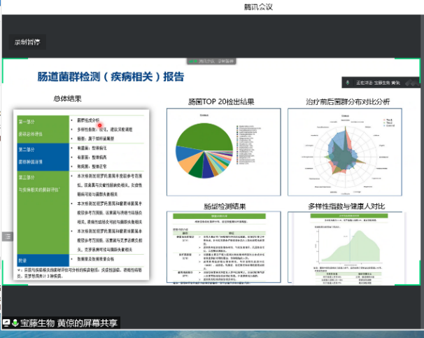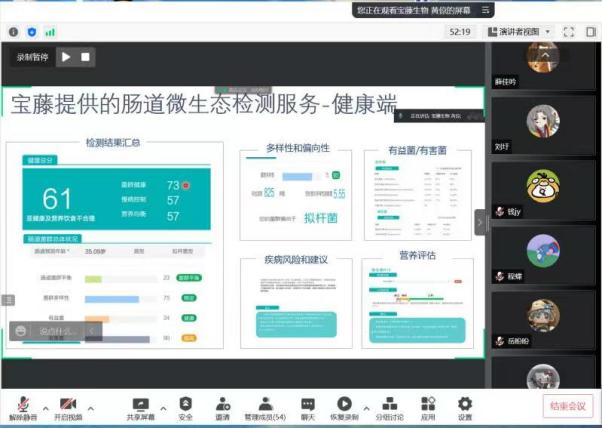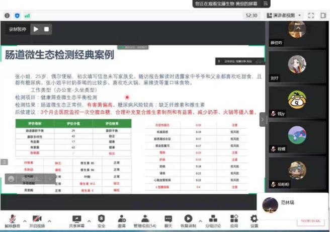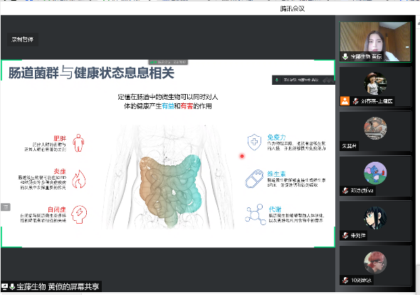 会上,黄经理介绍了肠道微生态与代谢性疾病、神经系统疾病、心血管疾病、新冠肺炎、癌症的关系,表示肠道菌群在维持机体健康中的重要作用。随后,黄经理分享了他们公司承担的国家创新项目微生态在团队创新力、科研平台、质控保障等方面的优势,重点介绍了宝腾生物提供的肠道微生态检测服务项目,分享了肠道微生态检测经典案例,解读了肠道菌群检测报告等相关健康服务,探讨了粪菌移植技术的发展趋势。粪菌移植技术在国内目前应用较多的领域为感染性腹泻、炎症性肠病、便秘等胃肠道疾病的治疗,粪菌移植作为一种新兴治疗技术,通过重建肠道微生态或能为某些临床难题提供新思路,为广大的患者带来福音,