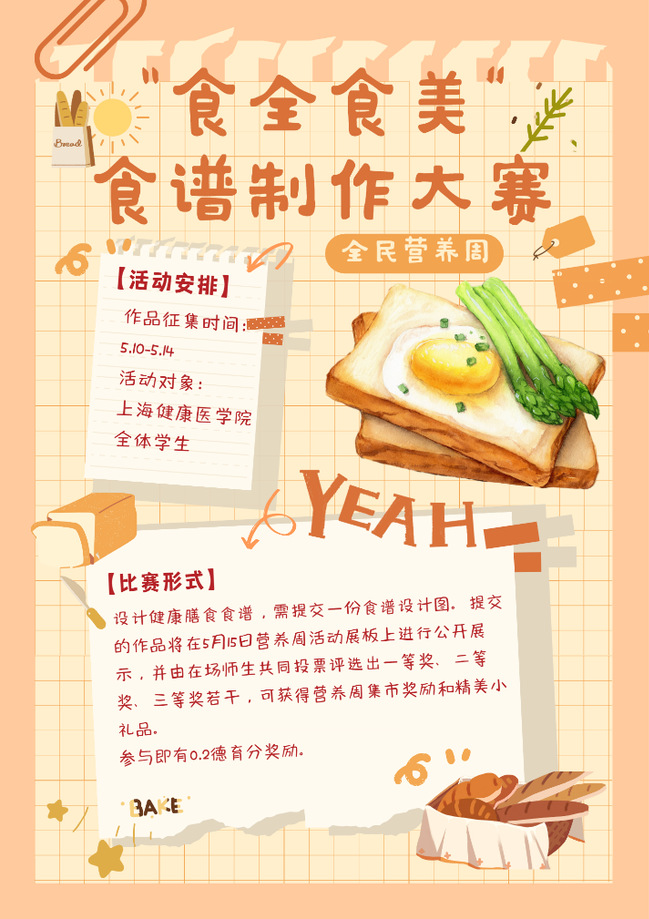 活动形式:设计健康膳食食谱,需提交一份食谱设计图。提交的作品将在5月15日营养周活动展板上进行公开展示,并由在场师生共同投票评选出一等奖、二等奖、三等奖若干,可获得营养周集市奖励和精美小礼品。(参与即有0.2德育分奖励)