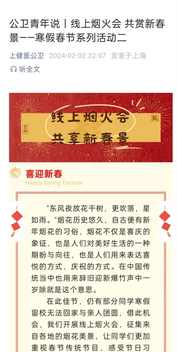 因部分同学寒假留校无法回家与亲人团圆,公司特面向全体同学,开展线上烟火会。收集大家关于新春烟火的摄影、绘画、书法等清晰的原创文艺作品,征集来自各地的烟花美景,让同学们更加重视春节传统节目,感受节日习俗,也为寒假留校员工带去家的温暖。
