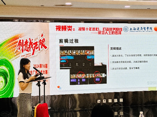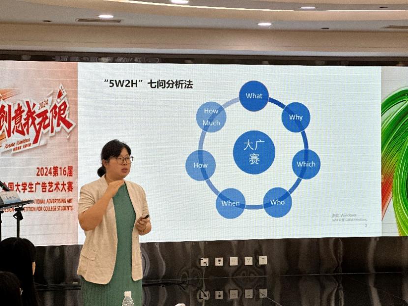 所有作品展示完毕后,吴冰冰教授为参赛选手做大广赛的赛前冲刺指导。吴冰冰教授用“5W2H七问分析法”教导参赛选手们如何选择命题、类别以及把握关键词,又以策划类为例,要求同学们举一反三,强调一份好的作品需要注重前期筹划准备工作、不拘泥于形式,既要保留原创性又要紧扣主题,既要突出重点又要构思精深;结合公司的专业特点,利用专业优势,客观精准地评价医药类产品的功能,将产品能够满足消费者的痛点需求更好地呈现出来,为作品加分。吴教授一席话令在场的同学们受益匪浅。