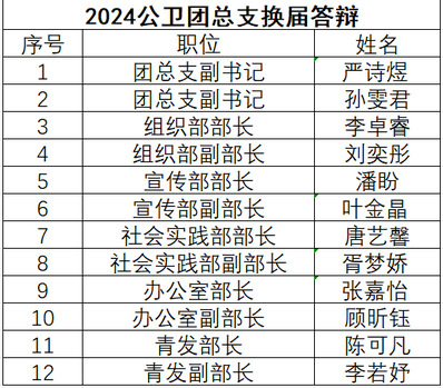 候选人竞选演说结束后,根据答辩表现和竞选人平时表现,对每一位选手进行了多方位评定与考察。经过综合考量与筛选,新任团总支干部名单如下: