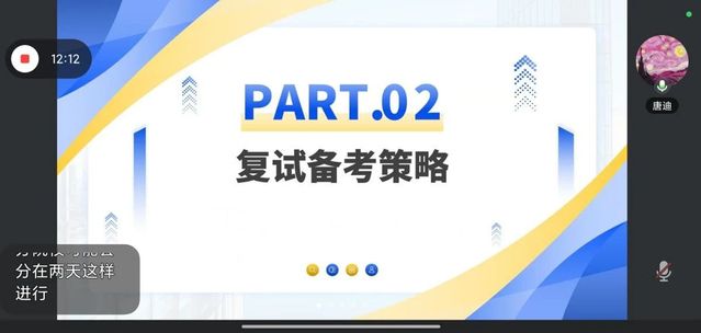 “复试是学术对话,而非单向评判。”唐老师和学长学姐们最后寄语考生,应将其视为与未来导师的思想碰撞,展现专业自信与成长型思维。本次考研复试、调剂指导会的成功举办,为2025届考研学子提供了宝贵的经验借鉴,帮助他们明确了备考方向,增强了复试信心。相信在公司的关心与老师的悉心指导下,同学们定能在考研复试中收获佳绩,迈向新的学习征程。