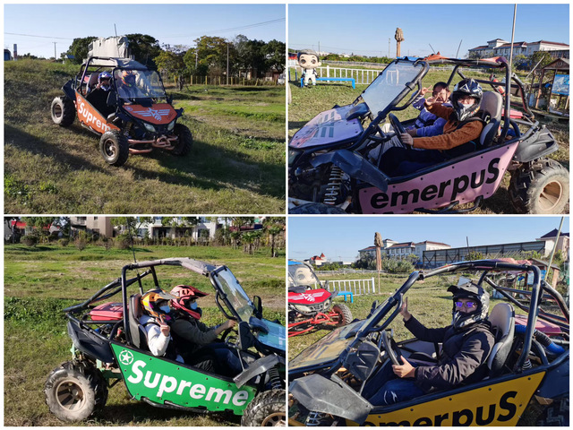 横沙岛基本处于原生自然状态,生态环境优良。采摘园内橘树硕果累累,金黄的果实挂满枝头。老师们穿梭于果树间,有的在挑选饱满的柑橘,有的研究如何辨别甜度,采摘园里洋溢着秋收的快乐。采摘后,老师们来到越野卡丁车基地,体验风驰电掣地竞速。引擎轰鸣声中,平日伏案工作的老师们化身“赛道车手”,团队协作与竞技精神在互动中升温,大家都找回了员工时代的热血。