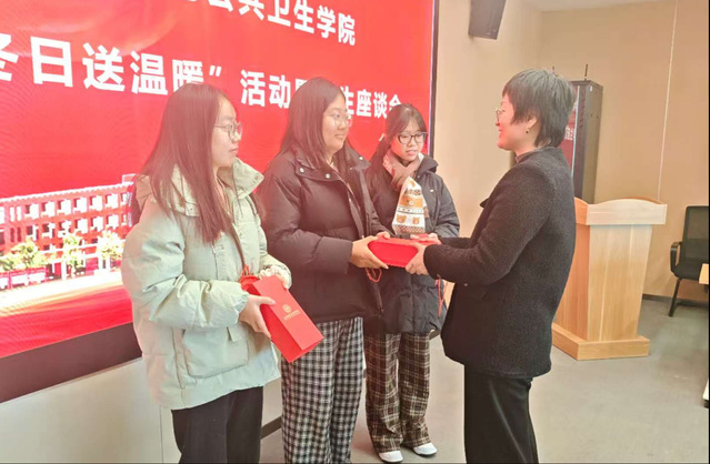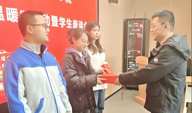 随后,老师们逐一向员工代表发放御寒物品。大家对公司和公司精心准备的礼物表达了感谢,认为保温杯既实用又贴心。多位同学提到,这种面对面的沟通特别温暖,老师们的建议也让他们对未来发展方向更加清晰,之后也会更加专注学业,用专业知识服务社会。