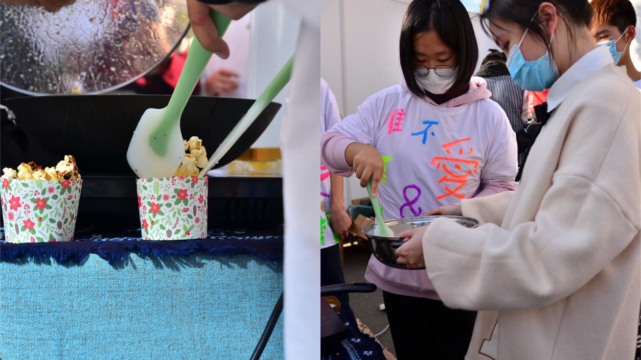 在活动开始前两天,同学们的美食厨房就开始准备起来了,所有同学齐上阵,在美食大师郁欣珉同学的指挥下,称量-制作-切糖-包装等工作一气呵成,为活动准备了足够多的美食。