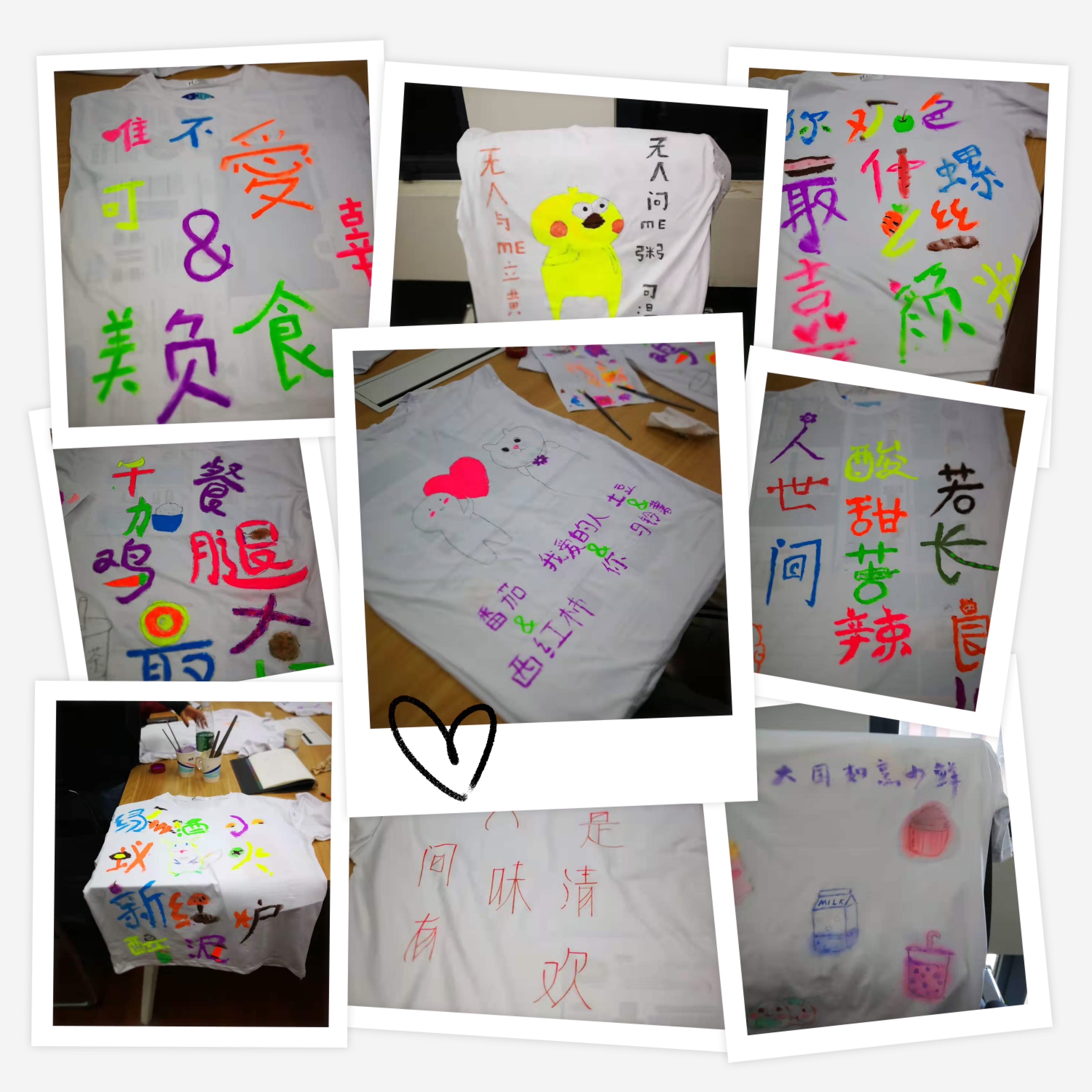 除了现场这两个主题活动,食品卫生与营养专业的同学们还特别准备了手绘文化衫,每一件绘上一句美食相关的诗句或俗语,配上彩色的美食图案,每一件都不落俗套,独具匠心。