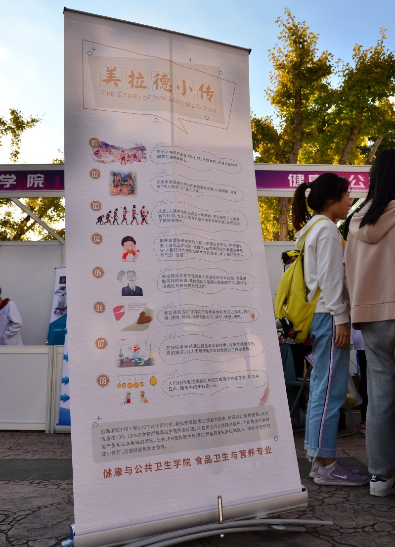 食品卫生与营养专业的同学们准备了两个项目:“舌尖上的化学”、“小小营养师”。“舌尖上的化学”通过现场制作和品尝雪花酥和爆米花,让同学们感受到舌尖上的化学所带来的美食的魅力。雪花酥和爆米花的迷人香味和色泽是美拉德反应的产物,美拉德反应隐藏着人类进化的秘密,是广泛存在于食物烹饪过程中的羰基化合物和氨基化合物间的反应。