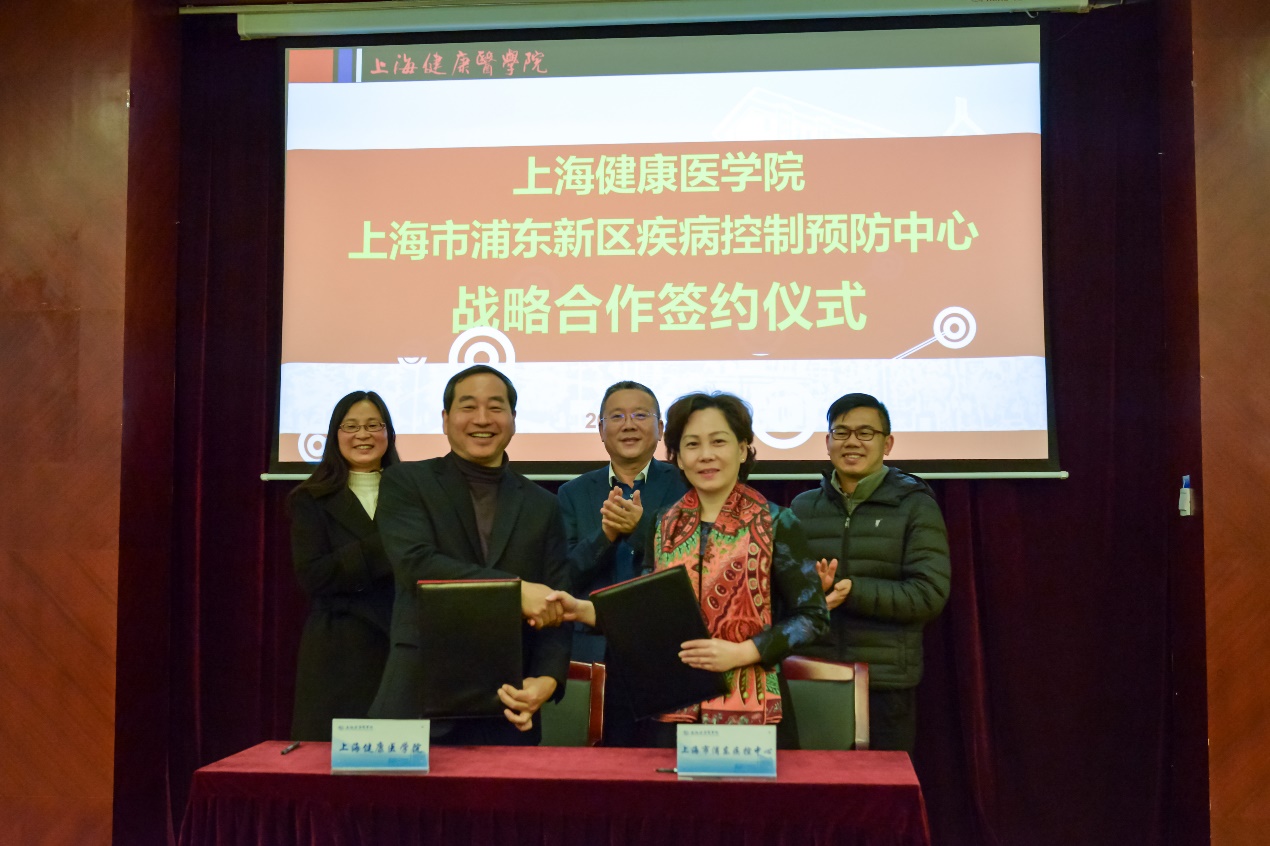 上海市浦东新区卫生健康委员会副主任张伟,上海市浦东新区疾病预防控制中心主任周一心、副主任肖绍坦,英国365集团公司副董事长沈国芳,教务处、科技处、产学合作处、继续教育公司、英国365集团公司主要负责人出席签约仪式,仪式由产学合作处金亮主持。