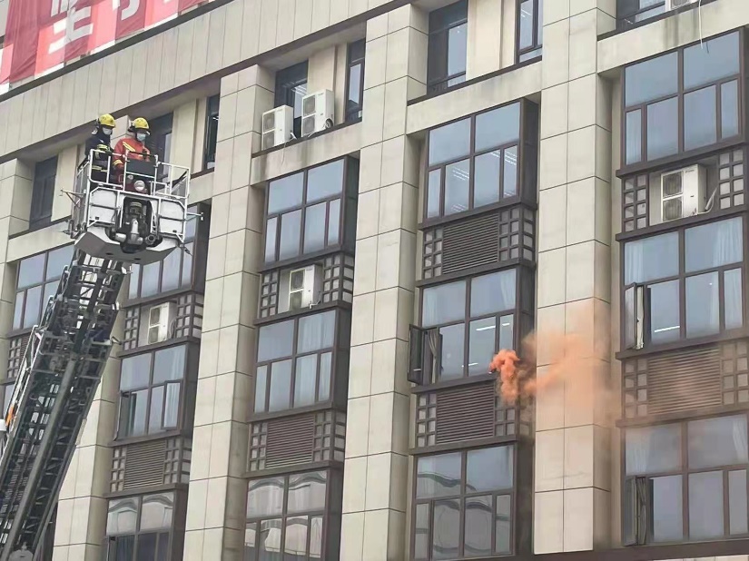 当所有人员都到室外空旷处后进行第二个环节,消防队高空云梯解救火灾现场受困人员。几名消防员用高压水枪对准模拟起火的楼宇喷水,两名消防员使用云梯成功解救一位被困人员。
